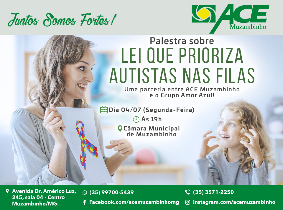 Quer saber mais sobre o assunto?! Na segunda, 04/07/22, na Câmara Municipal de Muzambinho, às 19h, a ACE Muzambinho em parceria com o grupo "Amor Azul" formado por diversas mães de autistas aqui de Muzambinho, realizará uma palestra explicando melhor essa lei e essa necessidade! Venha participar e saber mais!
