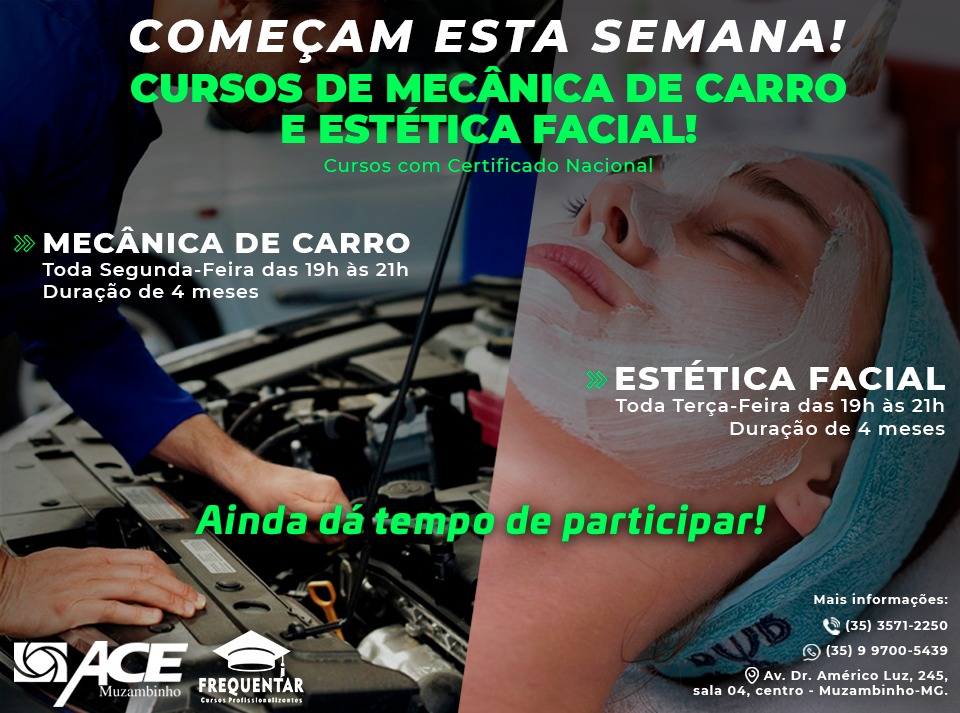 Esta semana começam os cursos de Mecânica de carro e Estética facial da Frequentar na ACE Muzambinho!